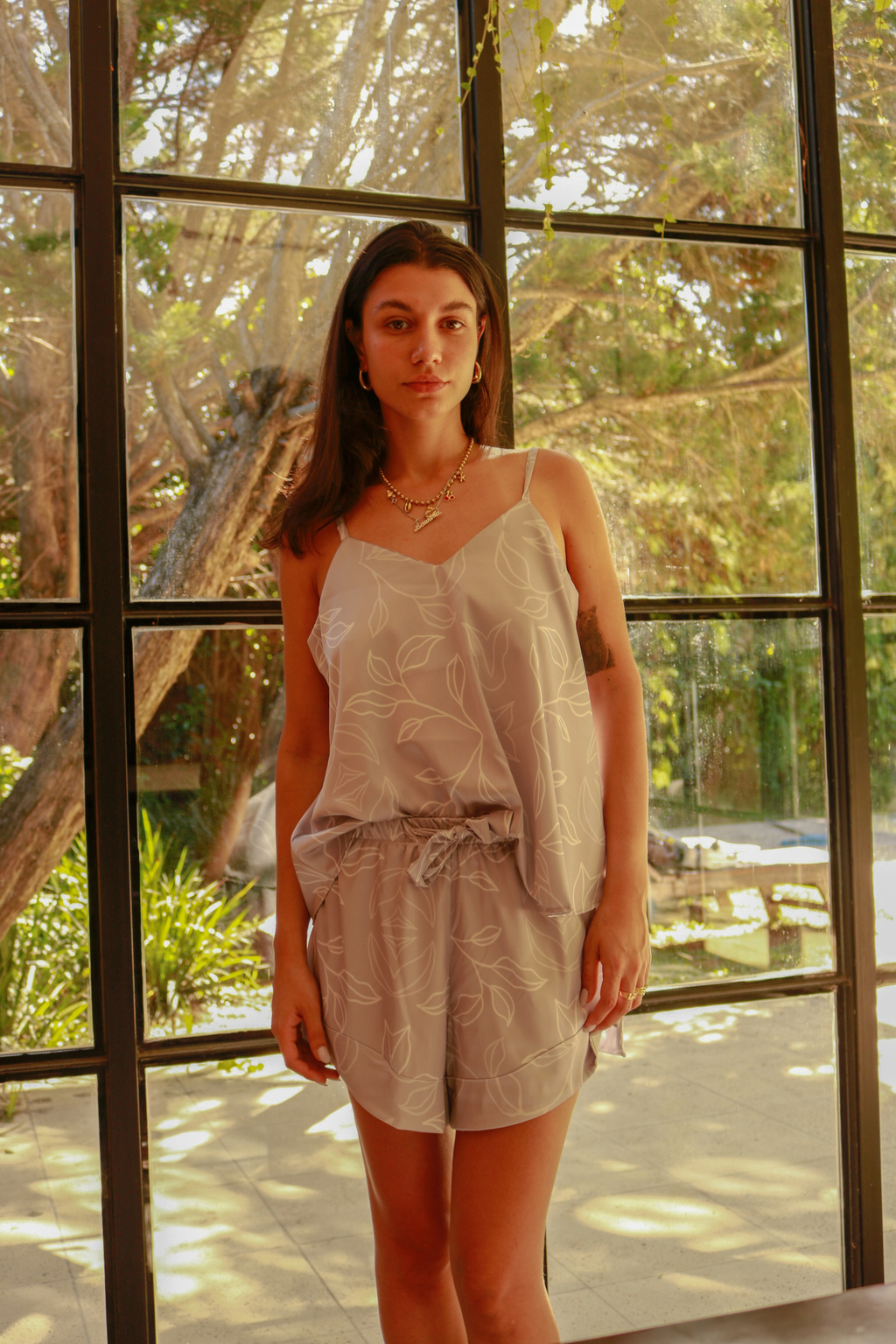 El short con cintura elástica y tirita ajustable se adapta a vos con suavidad, mientras que la musculosa, liviana y fresca, con tiras regulables, te acompaña con total libertad.
